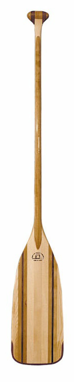 Laminated cherry and bass shaft with walnut and cherry scroll grip; cherry, ash, bass and walnut blade; extended urethane edging around tip. Large blade offers good directional control and acceleration. Good for moving water and those who prefer large blades with little slippage.